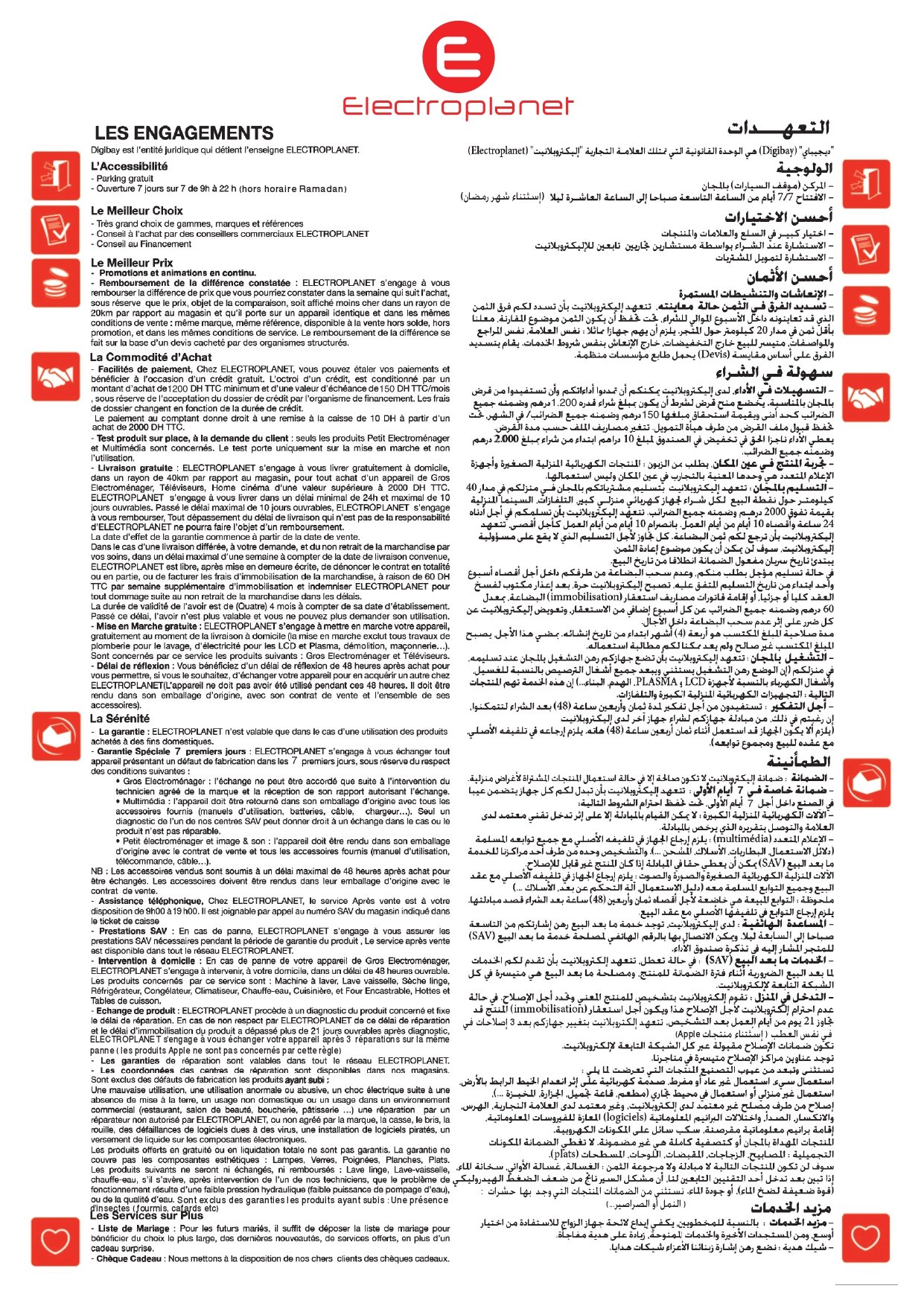 -Facilités de paiement : Chez ELECTROPLANET, vous pouvez étaler vos paiements et bénéficier à l’occasion d’un crédit gratuit. L’octroi d’un crédit est conditionné par un montant d’achat de 1800 DH TTC minimum et d’une valeur de traite de 150 Dhs TTC/mois, sous réserve d’acceptation du dossier de crédit par l’organisme de financement. Des frais de dossier d’une valeur de 220 DH TTC sont à prévoir. Le paiement comptant donne droit à une remise à la caisse de 10 DH à partir d'un montant d'achat de 1800 DH TTC.
